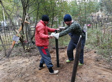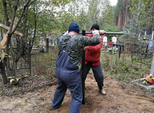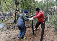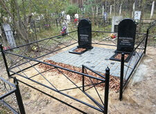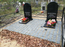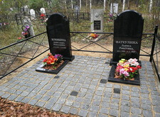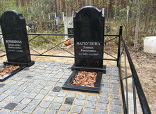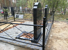 После создания основания мы покрыли территорию места захоронения гранитной брусчаткой, параллельно с этим установив заранее изготовленные памятники и цветники. Затем вернули на место металлическое ограждение и засыпали цветники и площадь перед брусчаткой корой. Этап работ на снимках не отображён, однако на приведённых ниже фото отлично виден итоговый результат.