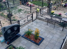 Подготовленную почву застелили геотекстилем, который будет препятствовать проростанию сорной травы в плиточных швах. В это же время на территории могилы были дополнительно установлены лавочка и столик.