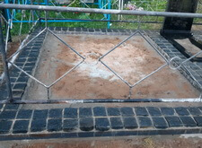 Под опоры ограждения в брусчатке были вырезаны соответствующие отверстия. Таким образом мы обошлись без ненужных сдвигов и неровных линий, получившийся периметр смотрелся одним целым.