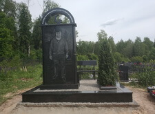Собираем лавочку, устанавливаем её напротив надгробья. Цветник у подножья мемориальной стелы наполняем светлыми камнями. Под полукруглую арку памятника укрепляем вырезанную из гранита фигуру полумесяца.