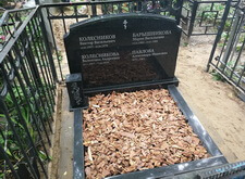 На утолщённую балку крепим памятник с заранее нанесёнными надписями. У подножья надгробья устанавливаем вазу с гравировкой, цветник засыпаем корой. Выступающее за границы цветника бетонное основание выглядит достаточно неряшливо, однако клиент не пожелал его скрывать или облицовывать.